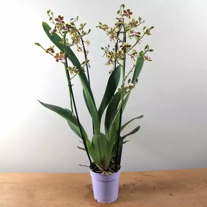 A hybrid orchid indoor houseplant with lime, plum and white flowers. Position: bright but indirect light Soil: these plants do not need to grow in compost, but if potting up, use a specialist orchid compost Rate of growth: average Hardiness: tender (indoors only) Current height: plant approximately 50cm Number of stems: 2 flower stems Pot cover: choose a 12.5cm pot cover to give a good fit over the pot. The lime green, plum and white flowers of this striking hybrid orchid can grow to around 4cm across, and as they will last for several weeks, they will make a stylish (and much longer lasting) alternative to a bunch of cut flowers. Home care: Water weekly by sitting the pot in a tray of water (or the kitchen sink) for 15 minutes so it can soak up as much as they like, then leave it to drain throughly before moving it back into position. Maintain temperatures around 15-24°C and keep them in a bright spot with protection from direct sunshine during spring and summer. Don’t worry if the roots grow outside the pot. In their native environment, they grow in the crooks of branches, and use these aerial roots to absorb water from the air. They do not mind being overcrowded in their pots, so you only need to repot them when the growth starts to suffer.