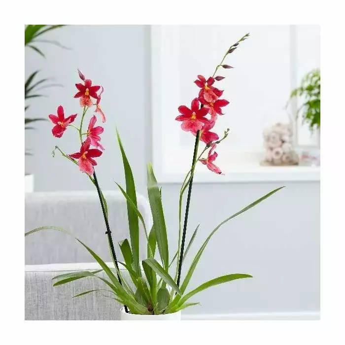 slightly sweetly fragranced. Position: bright but indirect light Soil: these plants do not need to grow in compost, but if potting up, use a specialist orchid compost Rate of growth: average Hardiness: tender (indoors only) Current height: approximately 60cm (+ or – 10% including the pot) Number of stems: 2 flower stems Pot cover: choose a 12.5cm orchid pot cover to give a good fit over the pot The showy red and apricot-orange flowers of this complex hybrid have a slightly sweet fragrance, which is quite rare for an orchid, and as each flower can last up to 6 weeks, they offer great value. Please note that the pot in the photograph is not supplied with the plant (which is sent out in a simple nursery pot). They do however make excellent potted plants, and if you wish to pot yours up, we do have a wide range of pots on our website to choose from. Home care: Water weekly by sitting the pot in a tray of water (or the kitchen sink) for 15 minutes so it can soak up as much as it likes, then leave it to drain thoroughly before moving it back into position. Maintain temperatures around 15-24°C and keep it in a bright spot with protection from direct sunshine during spring and summer. Don’t worry if the roots grow outside the pot. In their native environment, they grow in the crooks of branches, and use these aerial roots to absorb water from the air. They do not mind being overcrowded in their pots, so you only need to repot them when the growth starts to suffer.