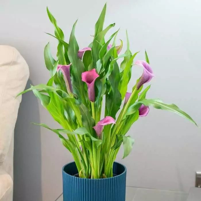 An elegant, tuberous, trumpet-flowered pot plant with colourful bracts. Position: bright but indirect light Soil: good potting compost Rate of growth: average Flowering period: spring Hardiness: tender (indoors only) Current height: approximately 40cm (+ or – 10% including the pot) Pot cover: choose a 16cm pot cover to give a good fit over the pot A tender Zantedeschia to be grown as a houseplant or graceful cut flower, especially in elegant, large flower arrangements. âPacoâ has luscious green arrow-shaped leaves and stunning deep purple pitchers with a mauve-pink border. The tuberous plant flowers on thick stems and is a real showstopper! Please note that the pot in the photograph is not supplied with the plant (which is sent out in a simple nursery alternative), but we have a wide and wonderful range on our website to choose from. Home care: Most importantly these plants like moisture. Like the forms grown in the garden they like a moist well-drained soil, so keep the compost damp but don’t let it sit in water. Feed with a high potassium feed after flowering.